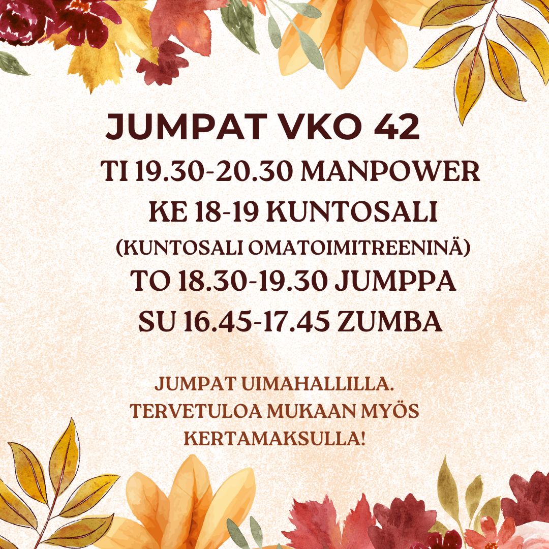 Kevätkausi loppuu viikolla 20 (torstai 16.5.2024 on viimeinen jumppa). Mutta alkukesän jumpat pidetään toukokuun loppuun, uimahallin alasalissa: