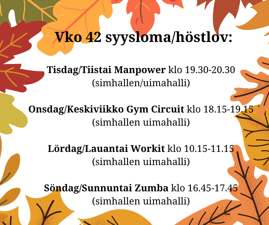 Nyt elokuu on täällä taas ja pikku hiljaa aloitamme syyskauden. Uimahallin tunnit alkavat viikolla 33 ja muut tunnit alkavat vähän eri aikoina myöhemmin syksyllä.
