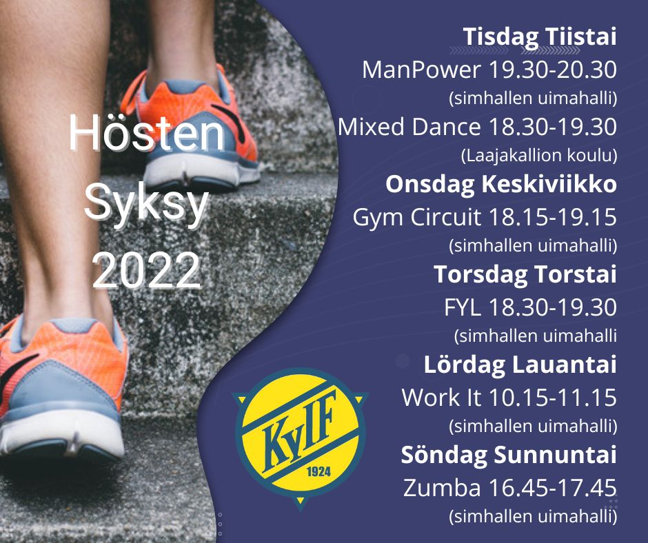 Torsdag / Torstai (18.8.2022-) klo.18.30-19.30 KyIF FYL, Kirkkonummen uimahalli (Pirjo-Riitta)