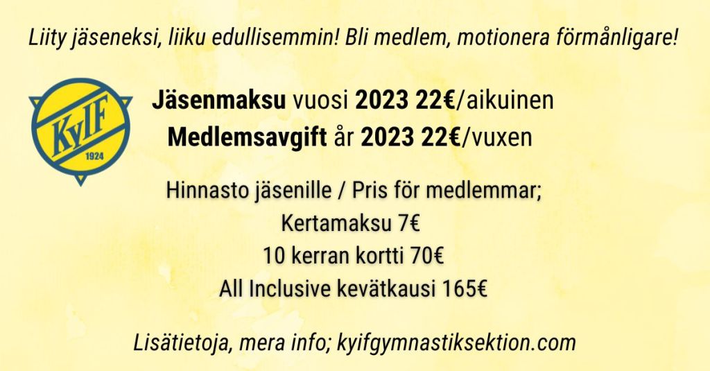 Måndagar och torsdagar 15.5-15.6.2023 och måndagar 31.7-28.8.2023. Engångsavgift: medlemmar 7€ / andra 8€